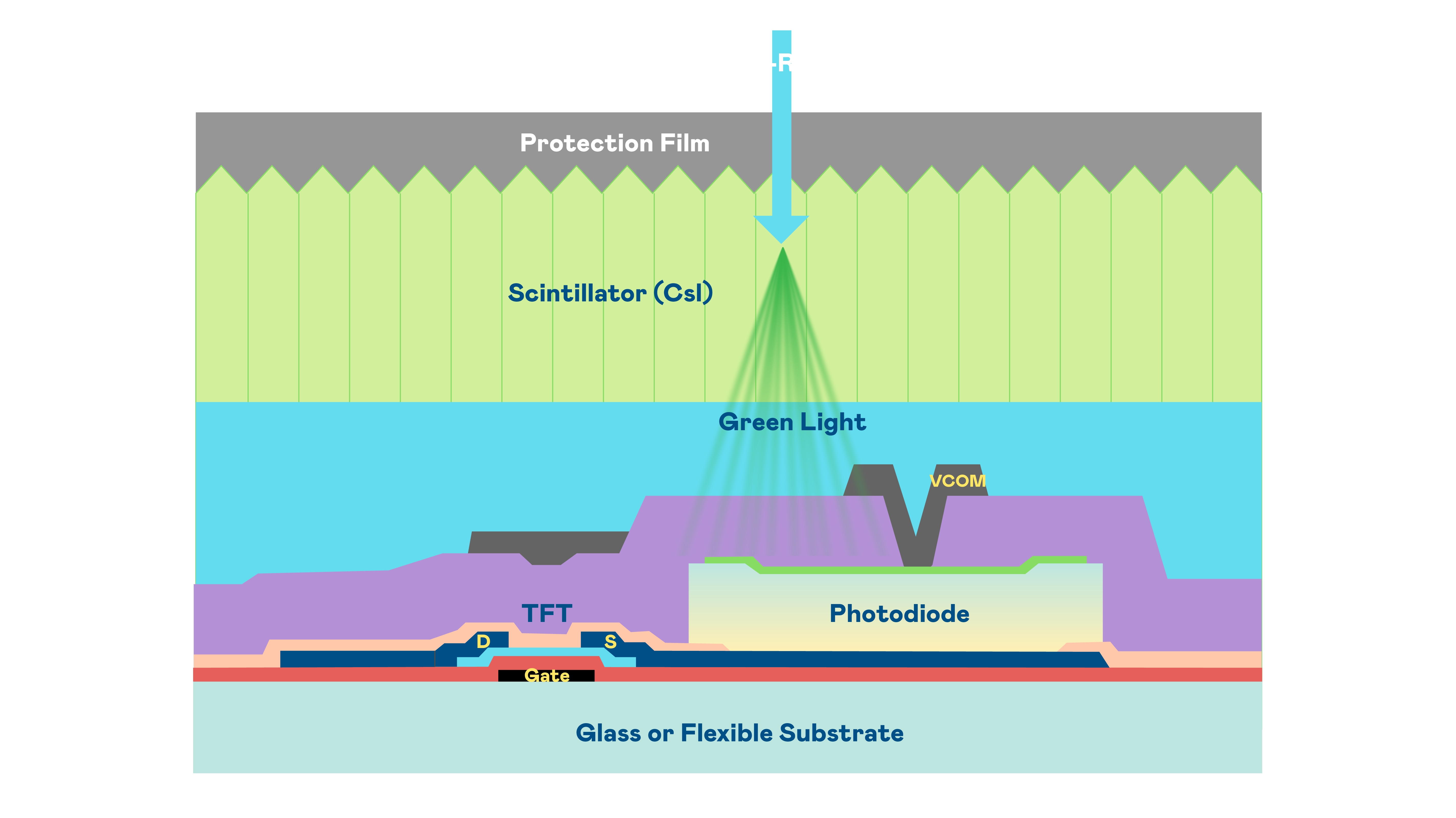 sunbet申搏的X光影像感测阵列使用薄膜电晶体 (TFT) 作为每个像素的读取开关,搭配光电二极体(Photodiode)的光电转换元件,用以感测X光影像讯号。